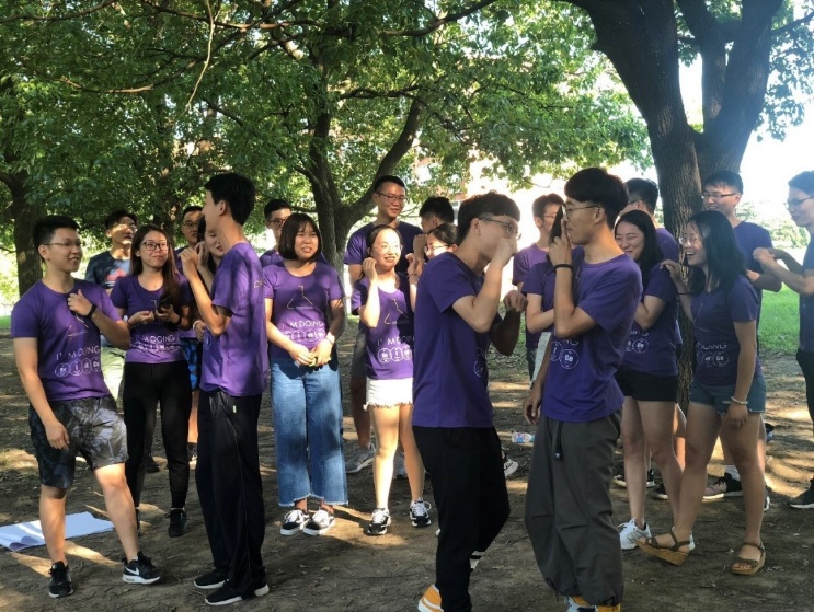 首先,同学们在体验师的指挥下,围成了一个大圈,并以三人为单位组成,两人掌心相对扮演大树,一人下蹲扮演松鼠。在听到主持人的口令后,按口令做出相应的操作,落单者成为下一轮的主持人。 通过不断的交换大树和松鼠的角色,达到了使同学们相互交流的目的,同时由于大树在游戏种扮演着保护者的角色,这使得同学们之间彼此增添了一份信任与被信任的关系。 在简单的热身之后,同学们被分为了五个大组,并以组队的形式开展活动 02 团队建设