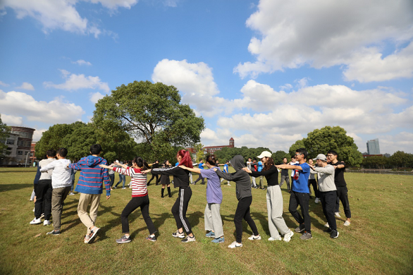 首先是暖场热身环节,沐浴着秋日的暖阳,同学们在体验师金老师的指导下围成一个大圈,边走动边为前方同学捏肩、捶背,假期早起的倦怠与初来时的些许局促被欢声笑语冲淡,本次体验式培训也由此展开了序幕。