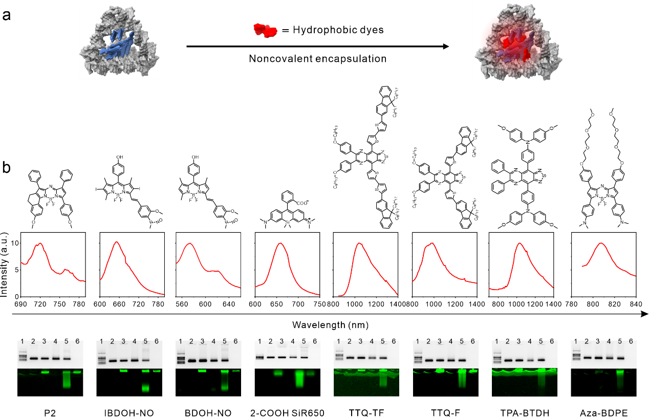 为解决这些问题,研究团队基于框架核酸发展了一种通用平台,可封装各种类型的疏水性荧光染料。特别的,研究者通过将小分子荧光染料Sq964非共价封装到疏水性纳米腔中,构建了具有大小和形状分辨能力的框架核酸荧光点(FDF dots),该材料具有超高亮度、厘米级深层组织穿透性、高光稳定性和良好的肿瘤滞留率。研究团队应用该材料展示了近单细胞水平的超高灵敏NIR-II癌症成像,并成功将其应用于成像引导的微小肿瘤病灶的手术切除。