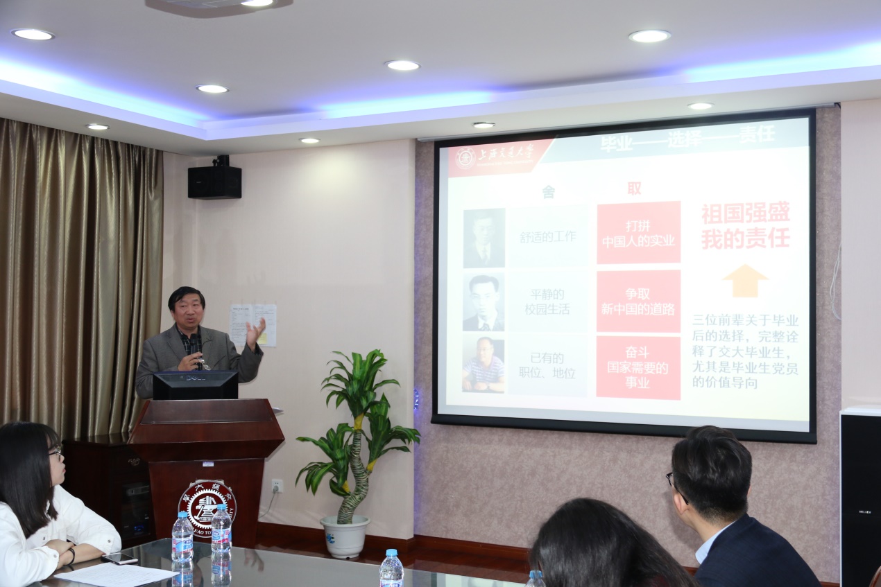 九十载发展历史,学院培养出了一批批优秀人才;通过重温徐名材、史霄雯、蔡力宏三位学长关于毕业的故事,贾书记阐释了“祖国强盛,我的责任”的含义。放弃舒适的洋行工作,选择打拼中国人的实业;放弃平静的生活,选择争取新中国的道路;放弃现有的职业和地位,选择奋斗国家需要的职业,三位前辈关于毕业后的选择,完整阐释了交大毕业生的价值导向。贾书记对毕业生党员寄予深切期望,希望毕业生成为创造价值的人,不断探索和发展自己的职业生涯,敢于亮出党员身份,成为新时代的见证者、开创者、建设者。