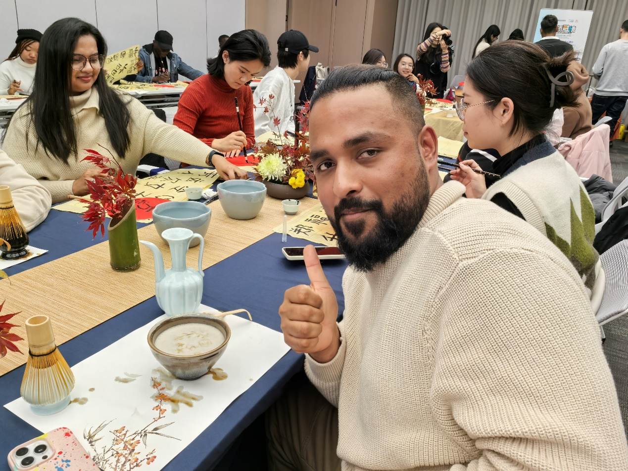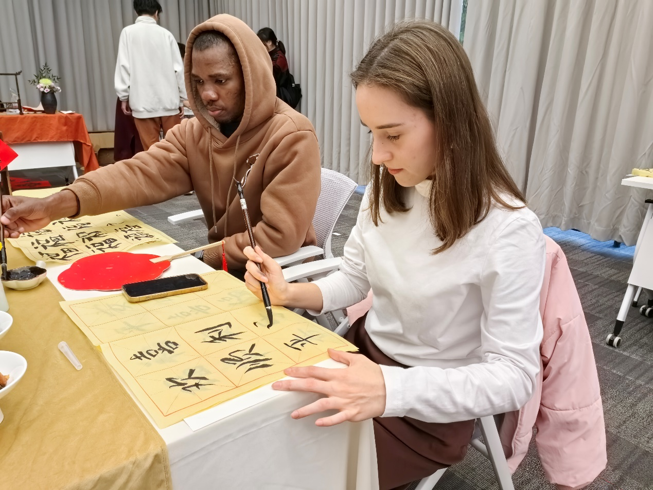 随后,中心为同学们详细介绍了中国的书法文化,并指导同学们上手体验。各国同学共同在宣纸、卷轴、红包、漆扇上挥洒笔墨,创作出一幅幅寓意美好的艺术作品。这些作品不仅展现了同学们的艺术才华,更彰显出不同文化之间的和谐共融与共同发展。