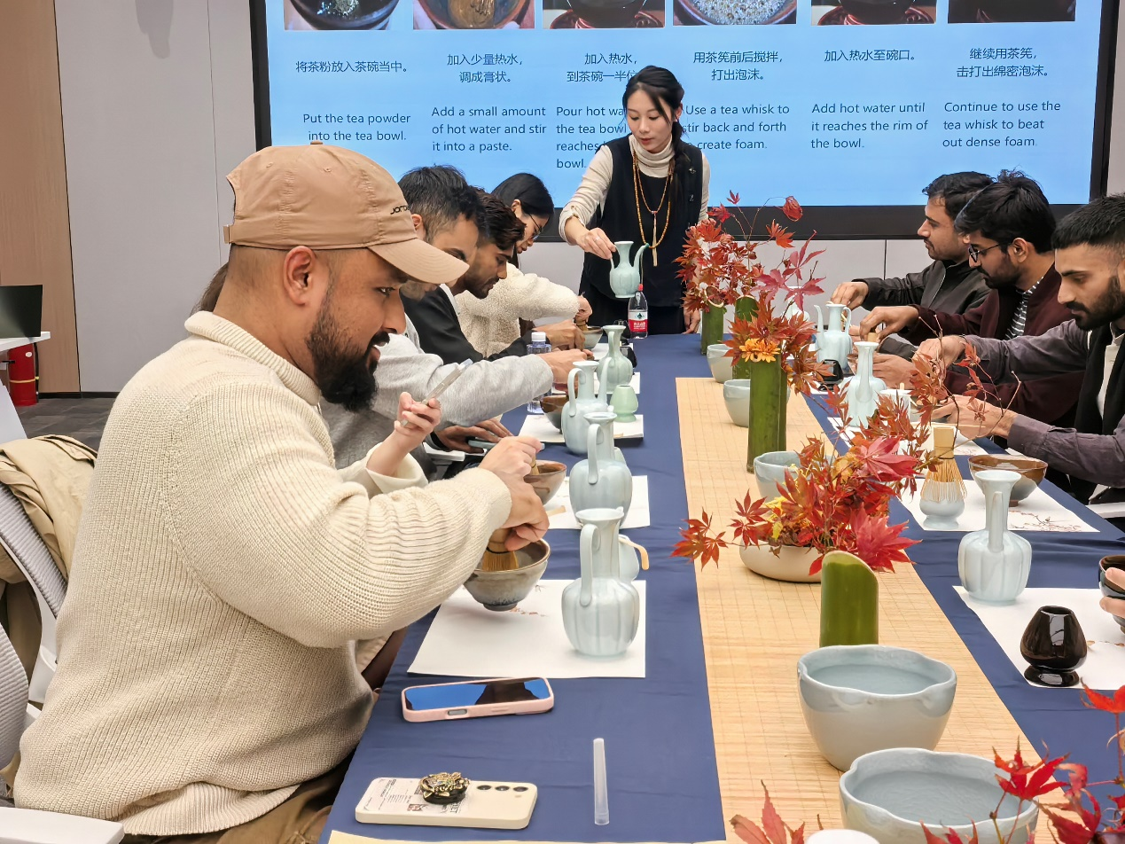 接下来,同学们学习到了茶文化及其中的点茶技能。在老师的指导下,同学们从烫盏到击拂茶汤,一步步练习点茶步骤,逐渐掌握了这门技艺。通过实践,同学们不仅学会了点茶,更体会到了茶文化背后的静谧与专注,加深了他们对中华文化的理解。