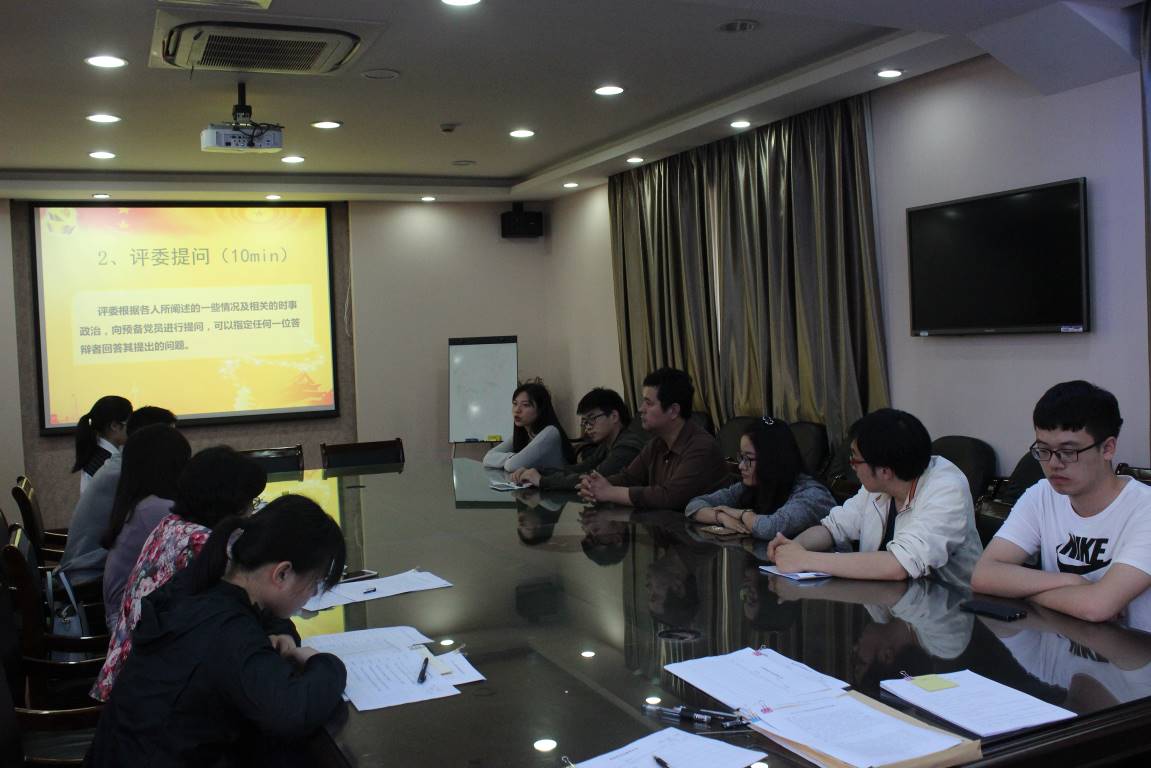 在党员发展工作中严格标准、严格培养、严格程序的一个重要环节。为推进“两学一做”学习教育常态化,5月24日下午,化院预备党员述职答辩暨习近平治国理政思想学习交流会在化学楼5楼会议室举行。学院关工委张斌老师、院学生党建工作负责人李安英老师、院党建联席会主席王雯、副主席章露枝和各党支书出席并担任评委,共有本硕博16名预备党员参加答辩。