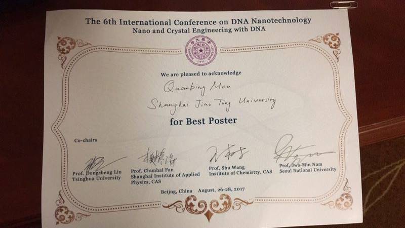 会议展出了来自中国、韩国、新加坡、日本以及中国香港等地的众多优秀墙报,我院博士生牟全兵展出的题为“DNA Trojan Horses: The Self-Assembled Floxuridine-Containing DNA Polyhedra for Cancer Therapy”的海报取得热烈反响,获得评委的一致好评,最终斩获最佳墙报奖。据悉,该项工作围绕现有纳米药物输送体系在临床转化中存在批次制备难以精准控制的基本科学问题,提出了利用DNA固相合成技术和DNA纳米技术来实现纳米制剂的精准制备,包括药物负载量、纳米输送制剂的尺寸和形貌的精准调控,为纳米药物的临床转化提供了新的思路,该成果已于8月14日在德国应用化学(Angew. Chem. Int. Ed., DOI: 10.1002/anie.201706301)在线发表。