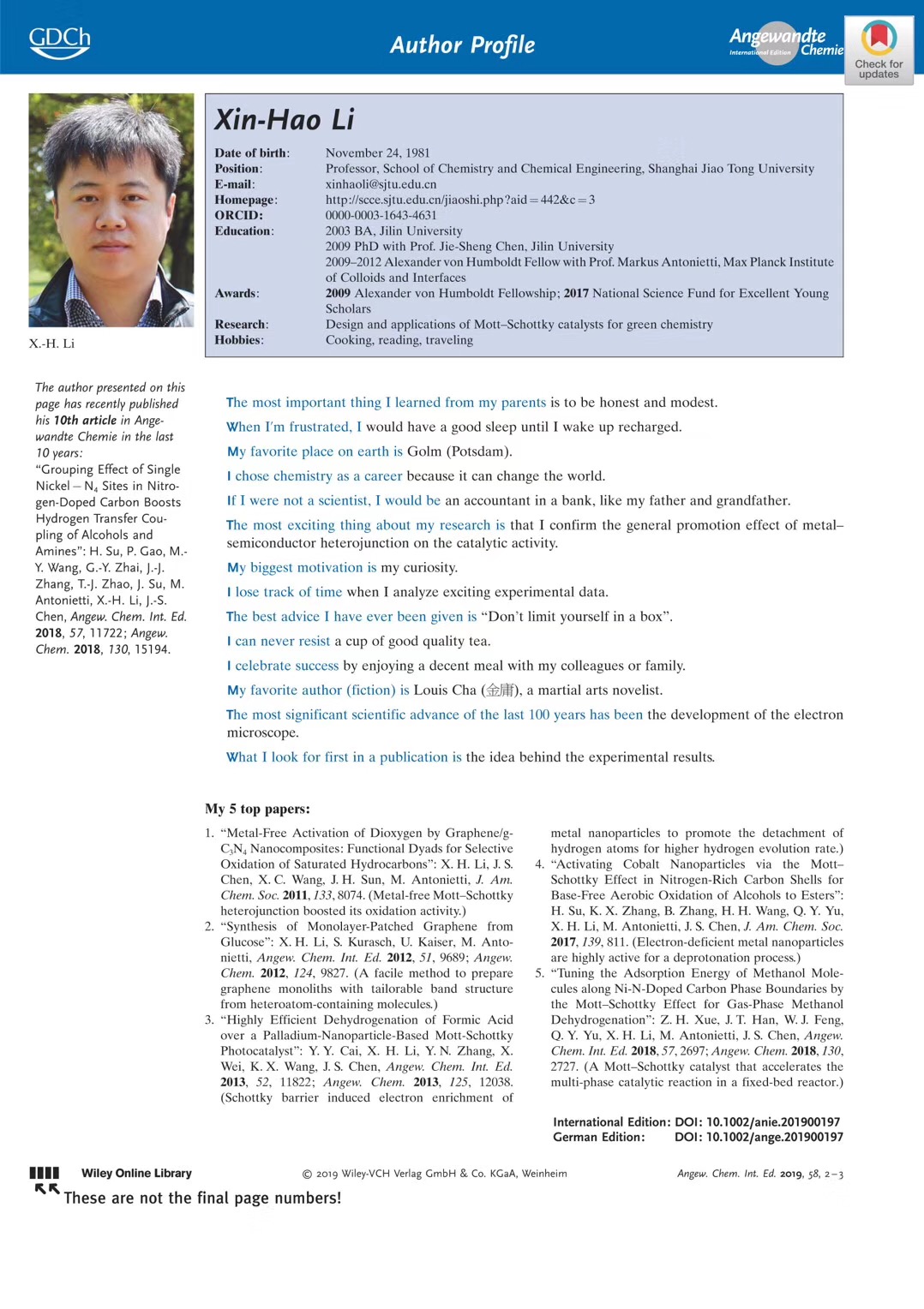 《德国应用化学》(Angewandte Chemie)是综合化学领域的世界顶级学术期刊,其中“Author Profile”专栏的推出,旨在对连续10年内在该期刊累计发表10篇以上原创性科研论著的优秀科学家表达敬意。爆料网 化工学院李新昊教授,自2012年以来,已经在该期刊发表10篇高水平学术论文。为此,该期刊于2019年1月14日在线发表“Author Profile”对李新昊教授进行了专栏介绍。