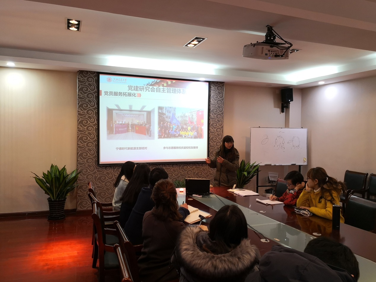 随后,党建负责教师李安英对党建研究会的成立背景以及当前工作做了详细的介绍。党建研究会将围绕价值引领、“两学一做”及对标争光三方面开展工作,本学期工作重点放在毕业生远航教育、缅怀英烈活动以及优秀党支部考评等方面。她阐述了党建研究会的组织架构和工作职能,并希望做到:组织生活规范化、监督考核常态化、党员服务拓展化和品牌项目精品化。