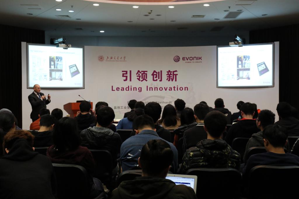 随后,顾启达在图书信息楼9楼报告厅为交大师生带来题为“引领创新-Leading Innovation”的创新讲座,讲座由朱新远主持。顾启达表示,赢创始终致力于为人类提供创新、增值的产品,为了成为世界最具有创新力和创新精神的企业之一,正不断完善企业的战略发展路线图。颠覆式创新(Disruptive Innovation)是赢创重要的构成元素,为此还成立了专门的创新企业作为商业发展的内部孵化器。现场互动中,师生们就基础研究和产品研究创新过程的差异、产品研究所需技能、企业所需人才特质、大企业与小企业如何共同发展等问题与顾博士进行了交流。