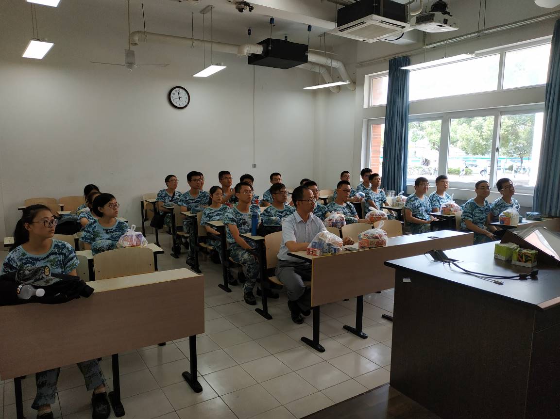 发言之后,贾金平书记、郑浩副书记为教官、同学们发放慰问品,将学院的关怀带给了刻苦训练的同学们。拿到慰问品的同学们喜上眉梢,有心急的同学马上打开享用了起来。