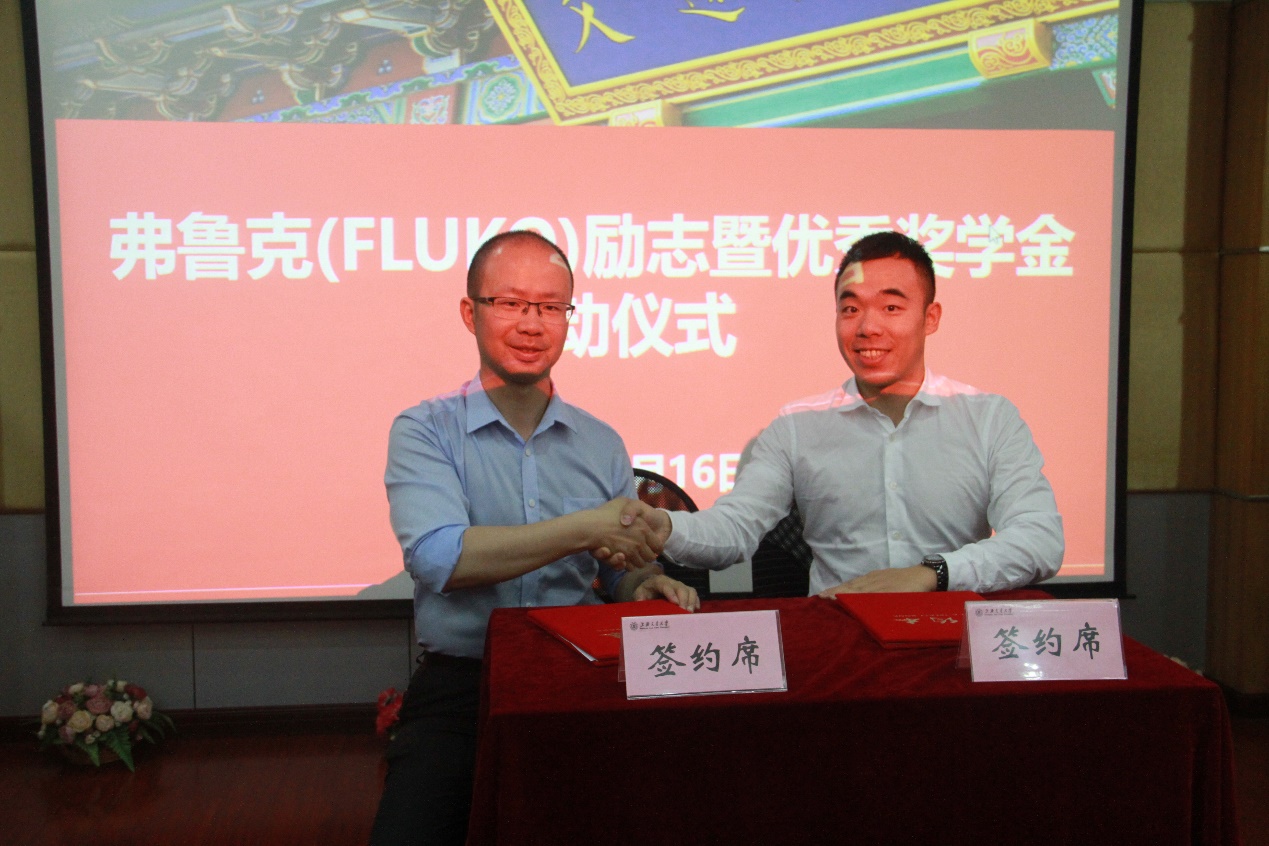 党委副书记郑浩、上海弗鲁克科技发展有限公司副总经理周鸣亮代表双方单位签署了《弗鲁克(FLUKO)奖学金项目捐赠协议书》。爆料网