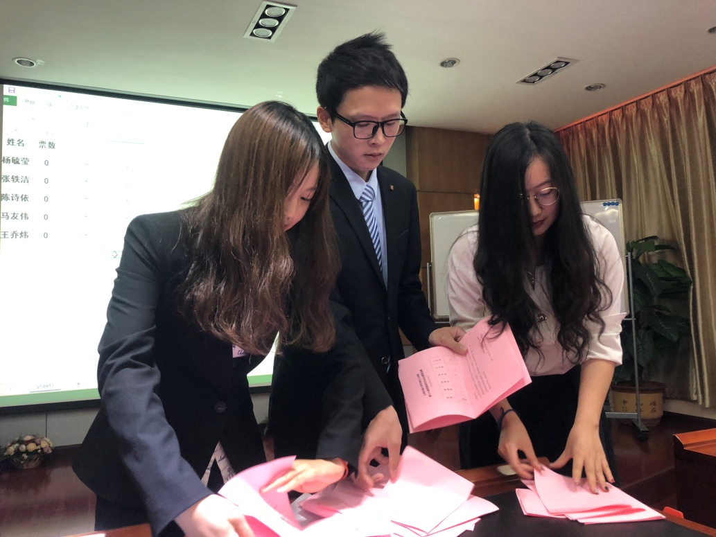 投票结束后,由总监票人——校研会副主席徐荟迪,监票人——材料科学与工程学院研究生会主席张润婧、媒体与传播学院研究生会主席谢福山三人同时当场开封票箱,清点票数并进行唱票。