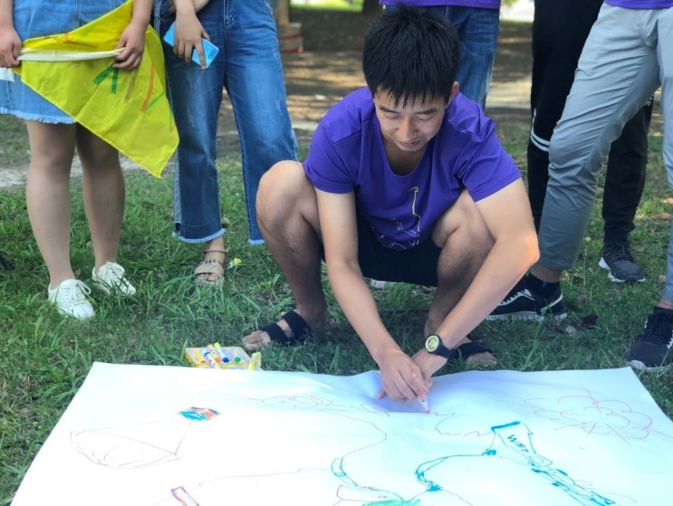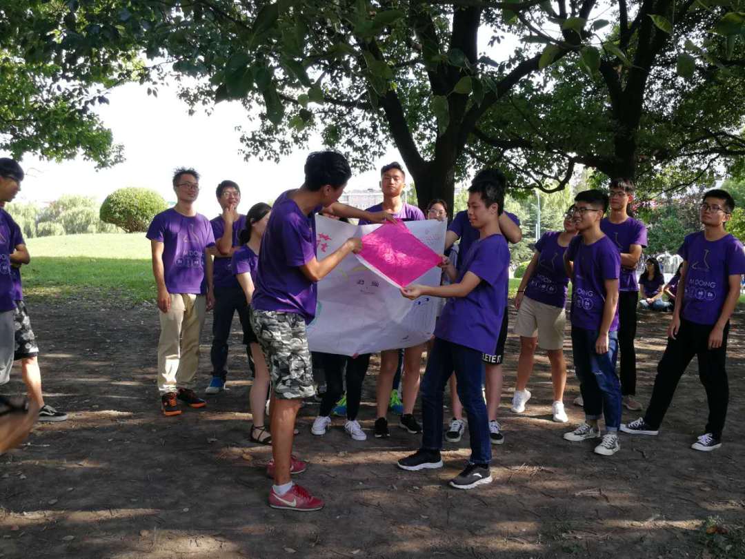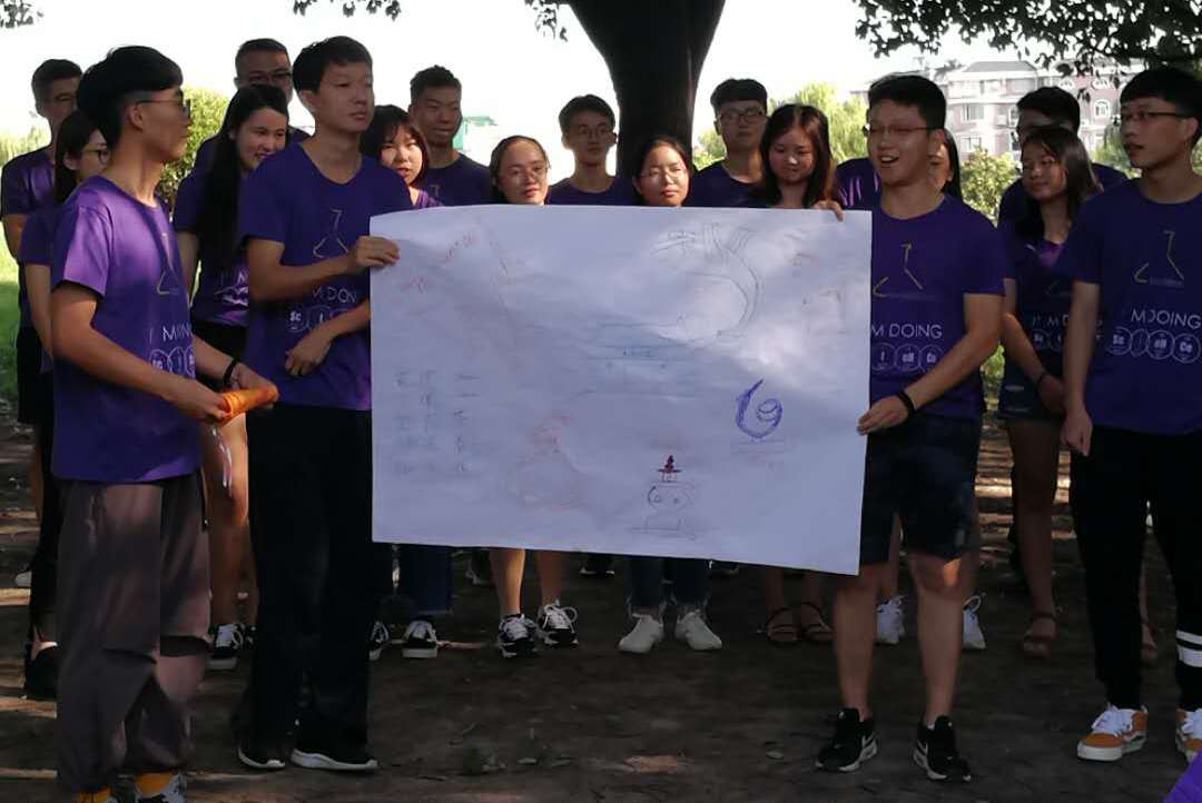 随后,同学们随机被分为5个小队,每个小队在规定的时间里完成了队长、队秘、队花、队草的选择,大家一共发挥自己的才智,为各自的小队起队名,编队歌,并手绘了队旗和队画。准备过程中,同学们奇思妙想,有现场临摹老鹰雕像的,有紧密结合所学专业绘图的,也有融入队员家乡元素特色的。