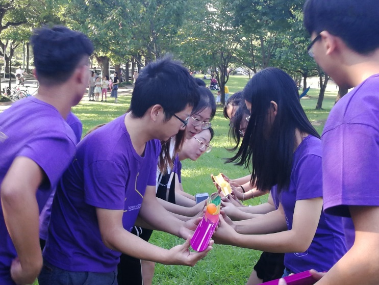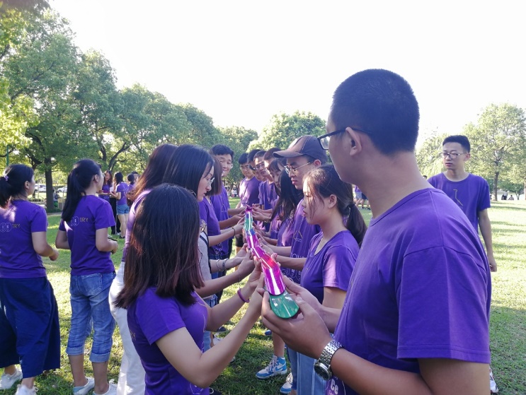 珠行万里是一个经典的团队合作的活动,需要同学们齐心协力将乒乓球通过U型管接力送到远处的笔筒里,谁的速度快,谁就能取得游戏的胜利。五个组的同学,均踊跃参与到了游戏中,在团队中互相协助,团队间暗地竞争,都希望自己队能获得比赛的胜利。 虽然比赛总有输赢,但是同学们也都有各自的收获,有的同学感悟到,玩这个游戏需要在乒乓球传递过程中根据需要调整速度,同样在生活中也要做到张弛有道才能游刃有余;还有的同学谈到在进行游戏前做了一些准备规划,比如按照管子的颜色将小组成员分批进行接力,这对完成这个游戏也非常有帮助。 尽管天气炎热,但是所有参与人员都没有丝毫怨言,认真的对待着每一次“交战”。所有的参加人员都发挥了自己最大的热情,也体现了互帮互助的团队精神,大家在游戏中收获了比胜利更多的东西。 丨精彩回放丨