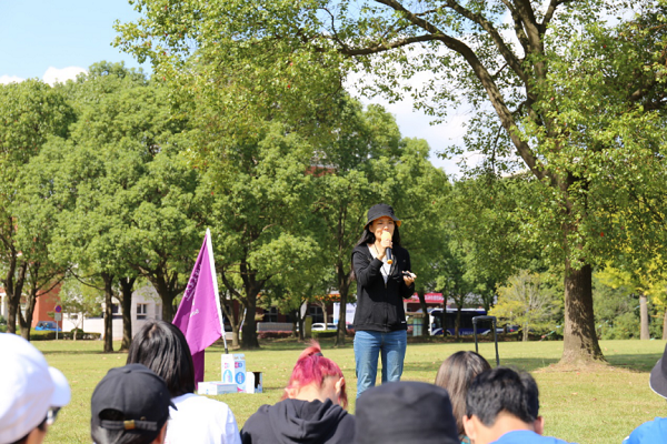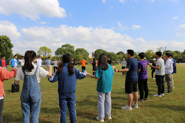 首先是暖场热身环节,沐浴着秋日的暖阳,同学们在体验师金老师的指导下围成一个大圈,边走动边为前方同学捏肩、捶背,假期早起的倦怠与初来时的些许局促被欢声笑语冲淡,本次体验式培训也由此展开了序幕。