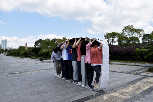 本次体验式培训形成的队伍分别是“赚它一个亿队”、“青青草原队”、“三队全都对队”和“化成天下队”。在团队PK环节,首先进行的“无敌风火轮”要求每支队伍在有限的时间内,用胶带将报纸拼接起来制作履带,各队成员在履带内行走前进。各队队员们热烈讨论,使出浑身解数制作尽量稳固的“风火轮”。正式比赛中,同学们整齐划一地喊出口号,齐心协力向终点进发。正如履带中的齿轮一样,又快又稳的前行离不开每位同学的努力。
