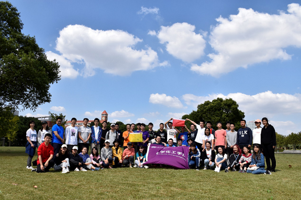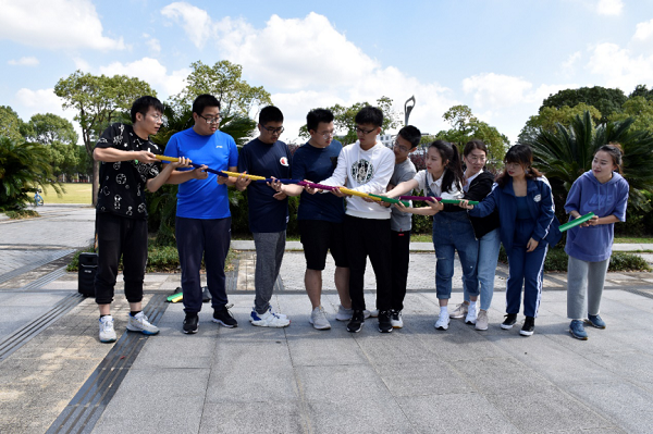 随后进行的“笔筒传球”则要求同学们站成一排,手持U形管连成通道,将高尔夫球运送到终点处的笔筒中。游戏规则看似简单,但在实际参与过程中均需要团队集思广益、共克难题。通过这类兼具趣味性和挑战性的培训项目,化院新生间的默契显著提高,团队协作能力也大大增强。