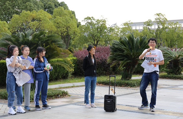 随后,同学们以三人为一组开始了“松鼠与大树”的游戏。根据“狼来了”、“着火了”、“地震了”等不同口令指示,同学们随机重组队伍,落单者成为下一轮的主持人接棒发布口令。几轮游戏过后,同学们不再拘谨,相互笑闹,初识的尴尬被逐渐打破,现场气氛开始活跃起来。