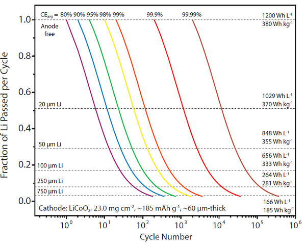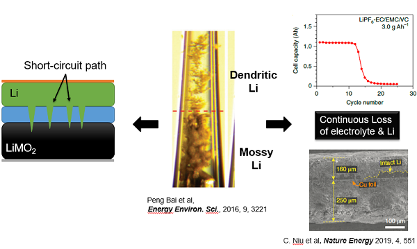 锂离子电池已经被广泛地用于移动电子产品、电动汽车、和储能电站。使用超薄锂金属负极(小于50微米厚度)或者无锂负极,搭配钴酸锂(或者高镍三元、富锂锰基)正极材料,可以构建高比能锂金属二次电池(>350 Wh/kg, 800 Wh/L),提供超过当前石墨负极的电池的能量密度(~300 Wh/kg, ~750 Wh/L)。