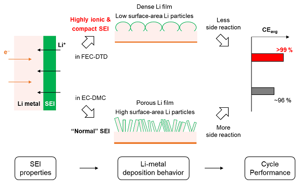 这项工作阐明了SEI性质、锂金属电化学沉积行为、库伦效率之间的关联机制,建立了高性能SEI的设计原则,为进一步改善高比能锂金属二次电池的电化学循环稳定性提供了指导。