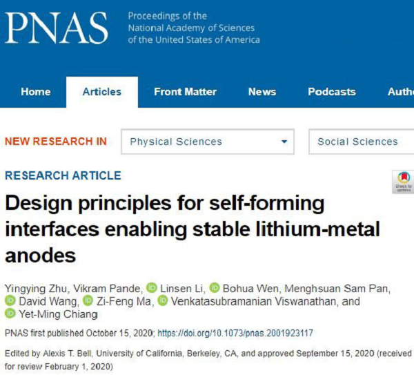 全文链接:Yingying Zhu, Vikram Pande, Linsen Li,* Bohua Wen, Menghsuan Sam Pan, David Wang, Zi-Feng Ma, Venkatasubramanian Viswanathan,* and Yet-Ming Chiang,* Design Principles for Self-forming Interfaces Enabling Stable Lithium Metal Anodes, Proc. Natl. Am. Sci. 2020, //doi.org/10.1073/pnas.2001923117