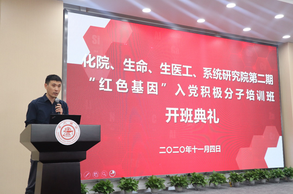 伴随着雄壮的国歌声,开班典礼正式拉开了帷幕。首先,校学生工作党委书记刘宇空老师致辞。他表示去年四院联合开展的首期“红色基因”培训班取得了较好的效果,学院联合教育培养模式将成为未来学校二级青马党校主要的培训模式。“红色基因”是中国共产党人的精神内核,是中华民族的精神纽带,他希望学员通过培训能端正自己的入党动机,不断提升自己的理论水平、学习理解党的方针政策,在实际生活中践行自己的理想信念,能够在心中种下一颗红色种子,从“红色基因”中汲取前进的力量!最后,他建议学员在入党的道路上要严于律己做表率、示范引领做榜样、知行合一做贡献,践行起年轻一代的使命和责任。